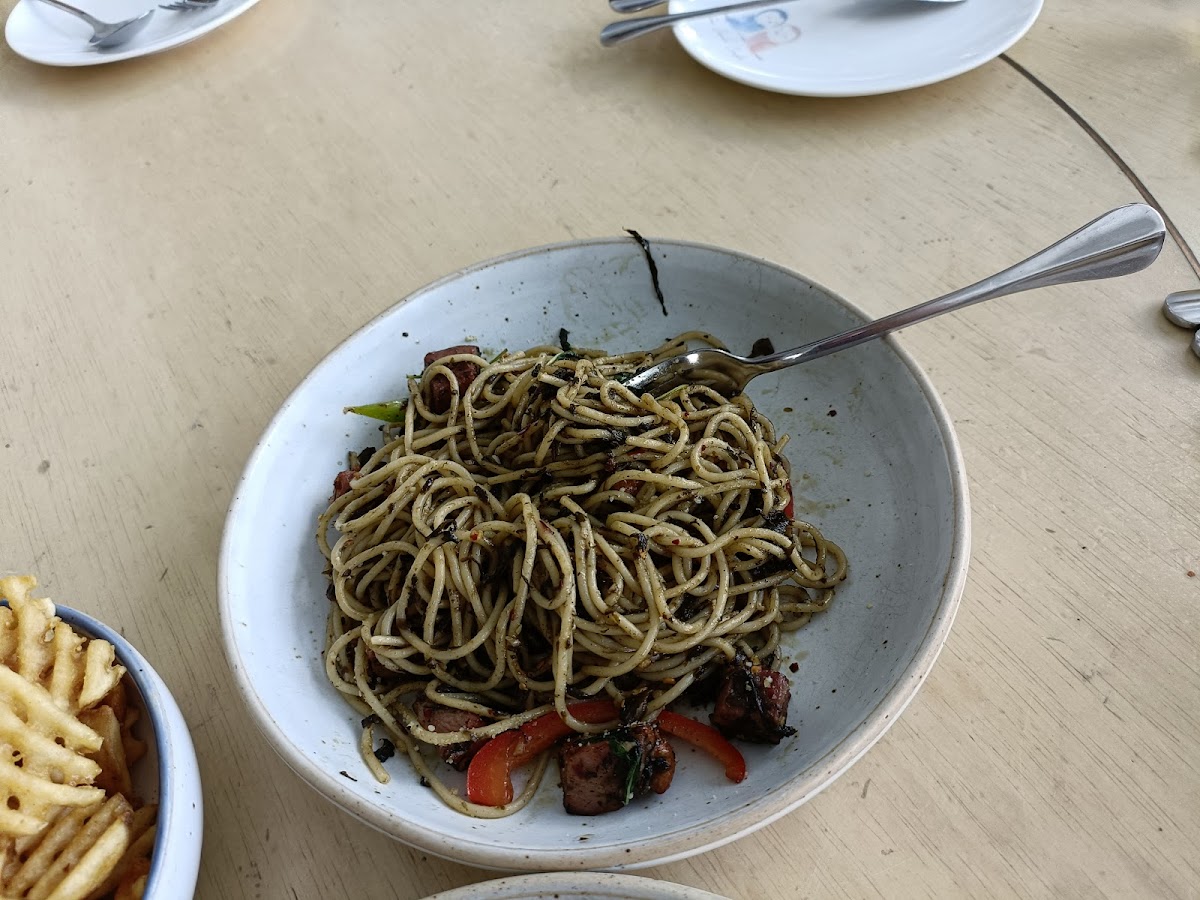 The smoked duck aglio olio was too salty and the garlic chili prawn pasta was tasteless Rebecca waffle was not crispy or freshly hot. I hope the food could improve itself. The servers are good and attentive as the place is also cozy. I gave feedback and they were nice enough to give a discount for the waffle coffee is good